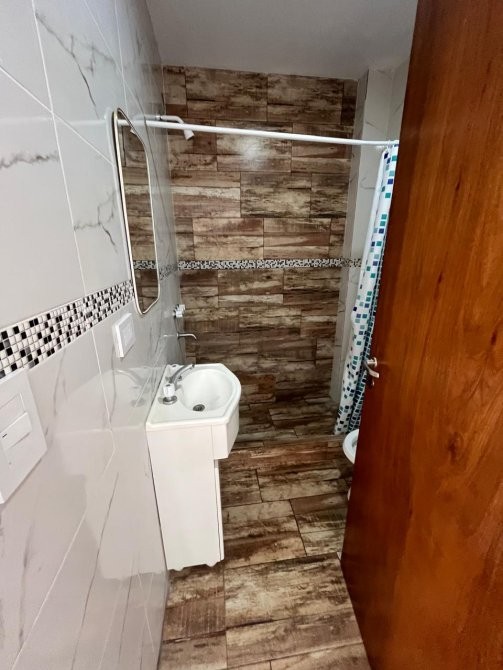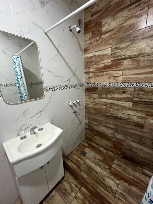 Baño completo, revestido con ceramica, sus pisos y paredes.